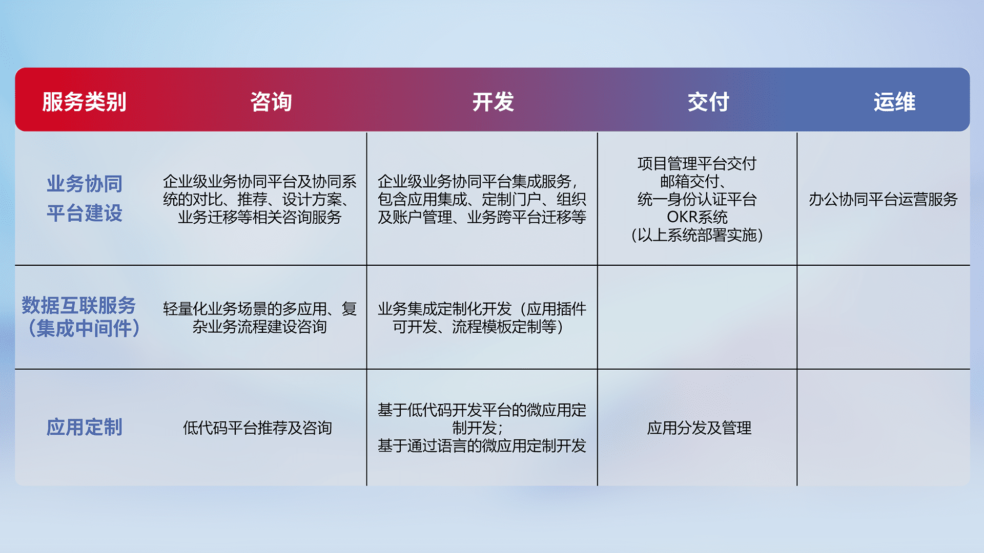 针对钉钉、、、、企微、、、、IDaas等平台级产品提供产品的规划、、、方案、、交付、、、、定制化开发等服务,,,实现如统一协同办公、、、、智能客户服务、、、、混合会议管理、、智能数据查询、、等业务场景,,实现数字化转型。。。
