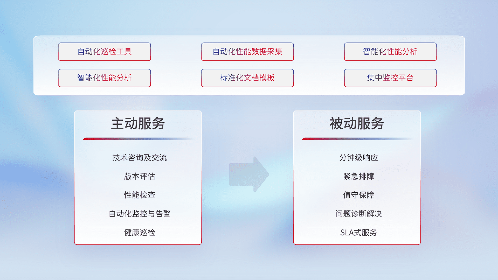 智能化工具和标准化文档,,保障服务质量,,提供主动服务(包含技术咨询、、、版本评估、、性能检查、、、、自动化监控与告警、、、健康巡检)和被动服务包含(分钟级响应、、、紧急排障、、、值守保障、、问题诊断解决、、、、SLA服务)。。。。
